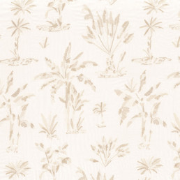 Along the River Congo, the Salonga Reserve is a natural reserve composed of a mosaic of rivers. The peaceful lakes are surrounded by lush vegetation. The water is represented by velvets, jacquards and voiles. They are defined by the matte and shiny interplay, their iridescent highlights and exquisite contrasts. The linen cloths welcome stylised plant embroideries, in kaleidoscopes of natural shades. The cotton satin is filled with a spectacular floral design. Embroidered in deep tones, lifted by a luminous white yarn the plants move elegantly to the rhythm of the kumba. A true ballet of plants, this choreography of foliage carries us far away, on the hot African wind.