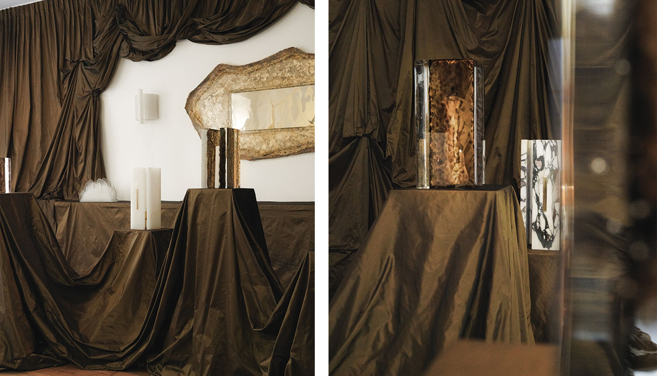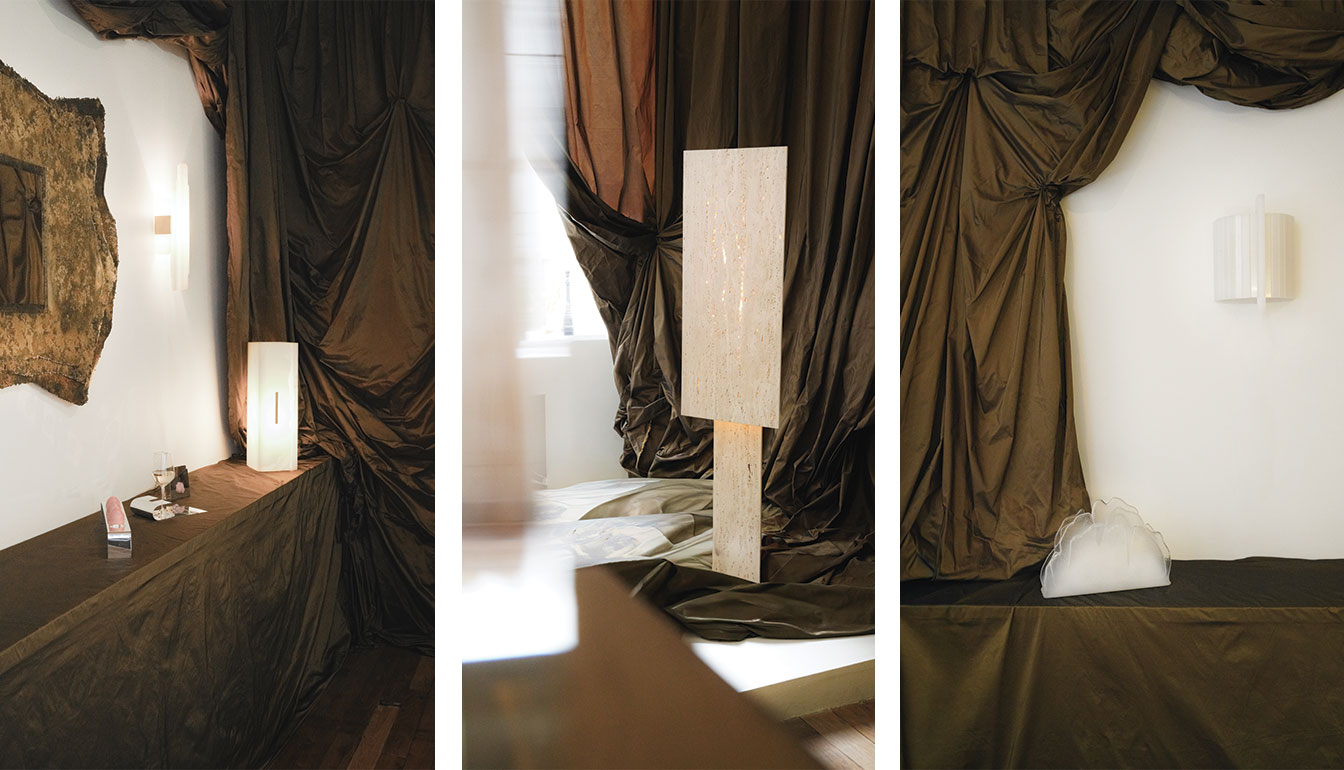 La réalisation du décor est confiée à l’atelier de tapisserie Relax Factory, dont le savoir-faire donne corps à l’espace. Drapés architecturés, lignes enveloppantes et volumes suspendus transforment la galerie en un écrin sculptural, où le tissu se déploie du mur au plafond. MENAGGIO enveloppe ainsi l’ensemble de l’exposition, à la manière d’un coffret précieux inspiré de l’univers de la haute joaillerie.